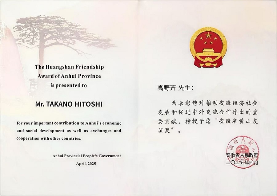 會上,公司日方副總經理高野齊因在推動安徽經濟社會發(fā)展和促進中外交流合作方面做出的重要貢獻,榮獲第十六屆安徽省黃山友誼獎。